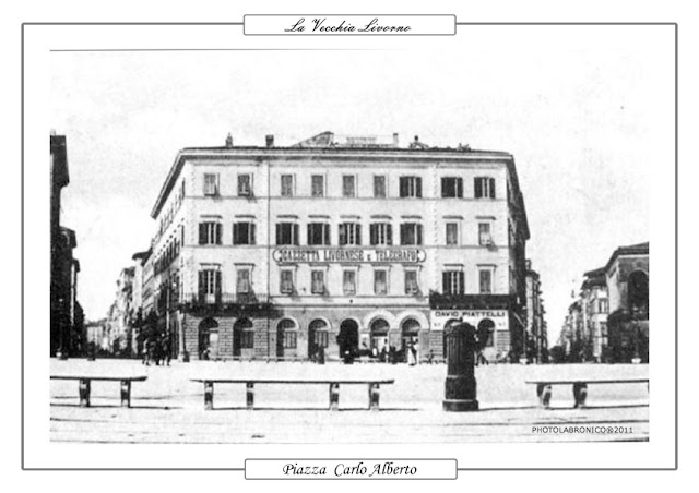 Nella piazza ripresa dall’inizio della via De Larderel si vedono, partendo da sinistra,